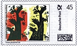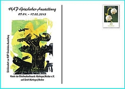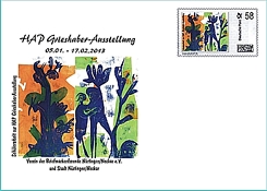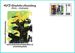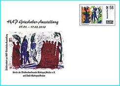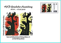 Alle Belege und die Briefmarken sind in der Ausstellung an unserem Verkaufstisch, der an den Wochenenden besetzt sein wird, erhältlich, die Belege blanko bzw. ungestempelt oder mit Sonderstempel. Post, die man in der Ausstellung in die dort aufgestellte Box wirft, wird mit dem Sonderstempel mit HAP Grieshaber-Motiv (entstanden ebenfalls aus einer Schülerarbeit) abgeschlagen. Die erste Leerung wird am 08., die letzte am 31. Januar vorgenommen. Die hier abgedruckte Abbildung zeigt in einer Montage, wie einer der Sonderumschläge, adressiert, mit Individual-Marke und Sonderstempel, aussehen wird.