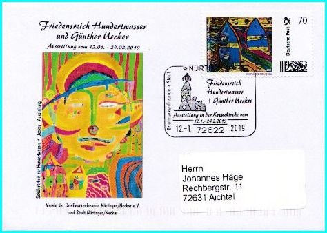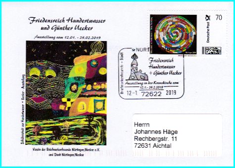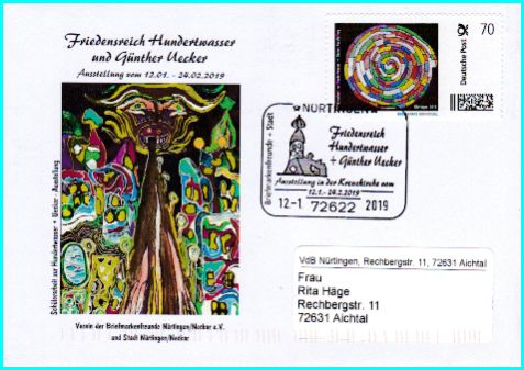 | Plusbrief, SSt. "Hundertwasser/Uecker" vom 12.01.2019, Ausstellung vom 12.01. - 24.02.19, Abb.: Schülerarbeit zur Ausstellung, Auflage: 235 Stück |