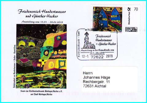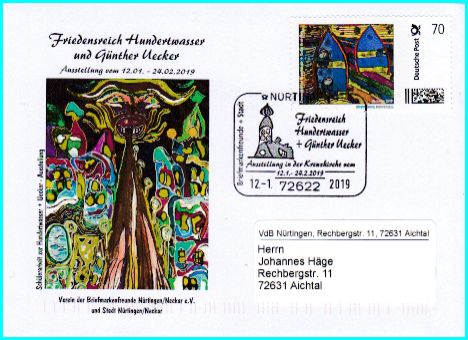 | Umschlag, SSt. "Hundertwasser/Uecker" vom 12.01.2019, Ausstellung vom 12.01. - 24.02.19, Abb.: Schülerarbeit zur Ausstellung, Auflage: 70 Stück | ![]() |