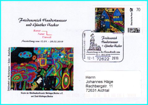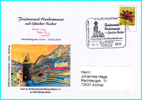 | Umschlag, SSt. "Hundertwasser/Uecker" vom 12.01.2019, Ausstellung vom 12.01. - 24.02.19, Abb.: Schülerarbeit zur Ausstellung, Auflage: 190 Stück |