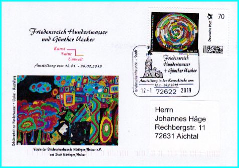 Umschlag, SSt. "Hundertwasser/Uecker" vom 12.01.2019, Ausstellung vom 12.01. - 24.02.19, Abb.: Schülerarbeit zur Ausstellung, Auflage: 80 Stück |