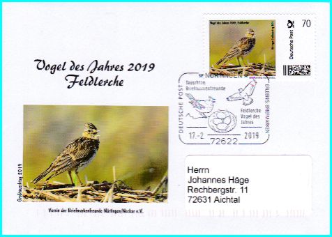 "Vogel des Jahres 2019, Feldlerche" vom 17.02.2019 Großtauschtag am 17.02.2019 Abb.: Feldlerche, Auflage: 190 Stück |
