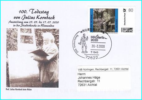 | Umschlag, (SSt. Hölderlin) vom 20.03.2020 100. Todestag (03.05.2020) von Julius Kornbeck, |