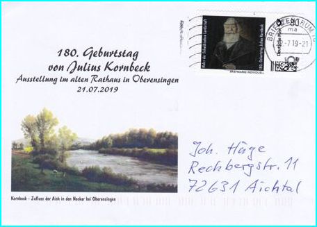 | Umschlag, TSt. vom 22.07.2019 180. Geburtstag von Julius Kornbeck, Ausstellung im Kornbeckzimmer im alten Rathaus in Oberensingen |