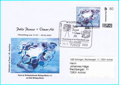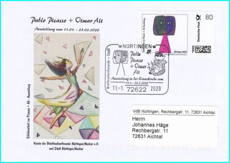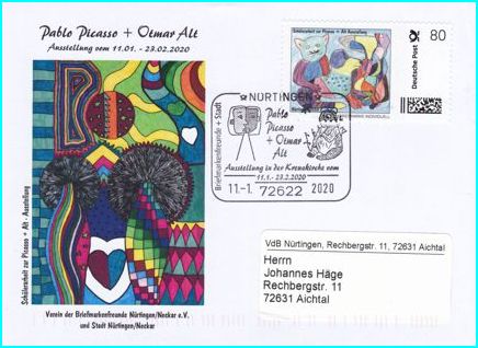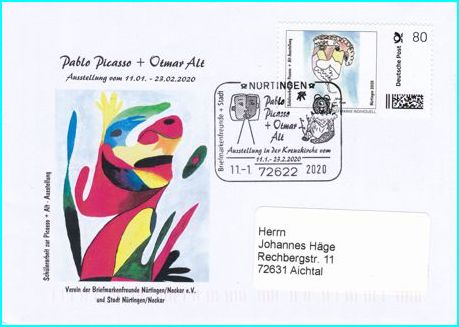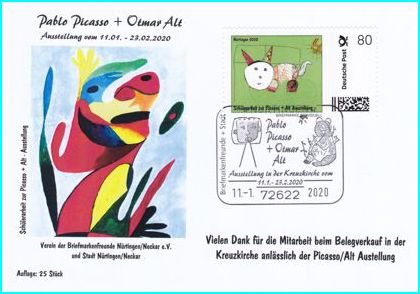 | Plusbrief, SSt. "Picasso-Alt" vom 11.01.2020, Ausstellung vom 11.01. - 23.02.20, Abb.: Schülerarbeit zur Ausstellung, Auflage: 50 Stück | ![]() |