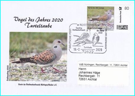 "Vogel des Jahres 2020, Turteltaube" vom 16.02.2020 Großtauschtag am 16.02.2020 Abb.: Turteltaube, Auflage: 190 Stück |